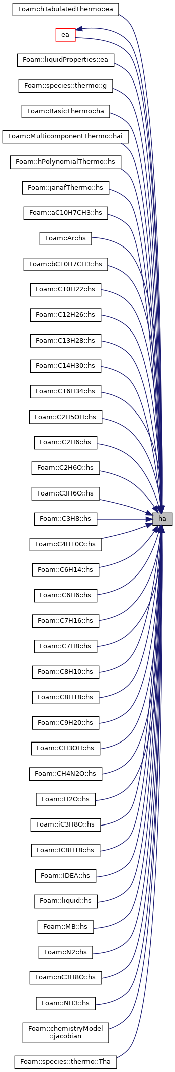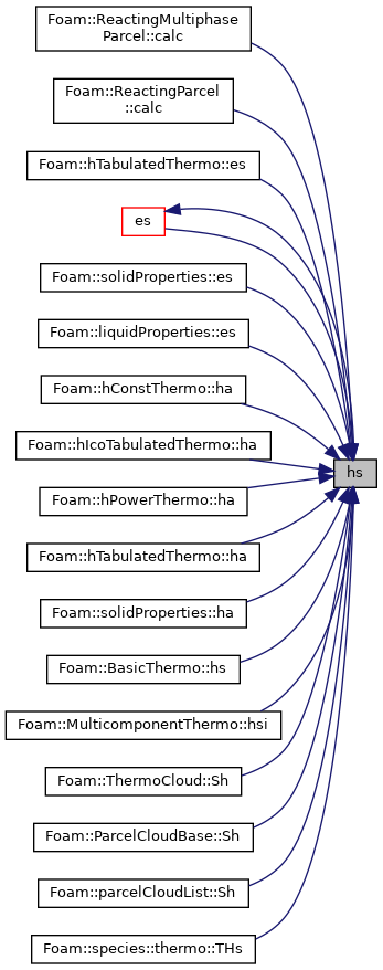 Referenced by ReactingMultiphaseParcel< ParcelType >::calc(), ReactingParcel< ParcelType >::calc(), hTabulatedThermo< EquationOfState >::es(), es(), solidProperties::es(), liquidProperties::es(), hConstThermo< EquationOfState >::ha(), hIcoTabulatedThermo< EquationOfState >::ha(), hPowerThermo< EquationOfState >::ha(), hTabulatedThermo< EquationOfState >::ha(), solidProperties::ha(), BasicThermo< MixtureType, BasicThermoType >::hs(), MulticomponentThermo< BaseThermo >::hsi(), ThermoCloud< CloudType >::Sh(), ParcelCloudBase< ParticleType >::Sh(), parcelCloudList::Sh(), and thermo< Thermo, Type >::THs().