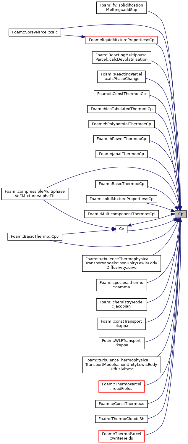 Referenced by solidificationMelting::addSup(), compressibleMultiphaseVoFMixture::alphaEff(), SprayParcel< ParcelType >::calc(), ReactingMultiphaseParcel< ParcelType >::calcDevolatilisation(), ReactingParcel< ParcelType >::calcPhaseChange(), hConstThermo< EquationOfState >::Cp(), hIcoTabulatedThermo< EquationOfState >::Cp(), hPolynomialThermo< EquationOfState, PolySize >::Cp(), hPowerThermo< EquationOfState >::Cp(), janafThermo< EquationOfState >::Cp(), liquidMixtureProperties::Cp(), BasicThermo< MixtureType, BasicThermoType >::Cp(), solidMixtureProperties::Cp(), MulticomponentThermo< BaseThermo >::Cpi(), BasicThermo< MixtureType, BasicThermoType >::Cpv(), Cv(), nonUnityLewisEddyDiffusivity< TurbulenceThermophysicalTransportModel >::divq(), thermo< Thermo, Type >::gamma(), chemistryModel< ThermoType >::jacobian(), constTransport< Thermo >::kappa(), WLFTransport< Thermo >::kappa(), nonUnityLewisEddyDiffusivity< TurbulenceThermophysicalTransportModel >::q(), ThermoParcel< ParcelType >::readFields(), eConstThermo< EquationOfState >::s(), ThermoCloud< CloudType >::Sh(), and ThermoParcel< ParcelType >::writeFields().