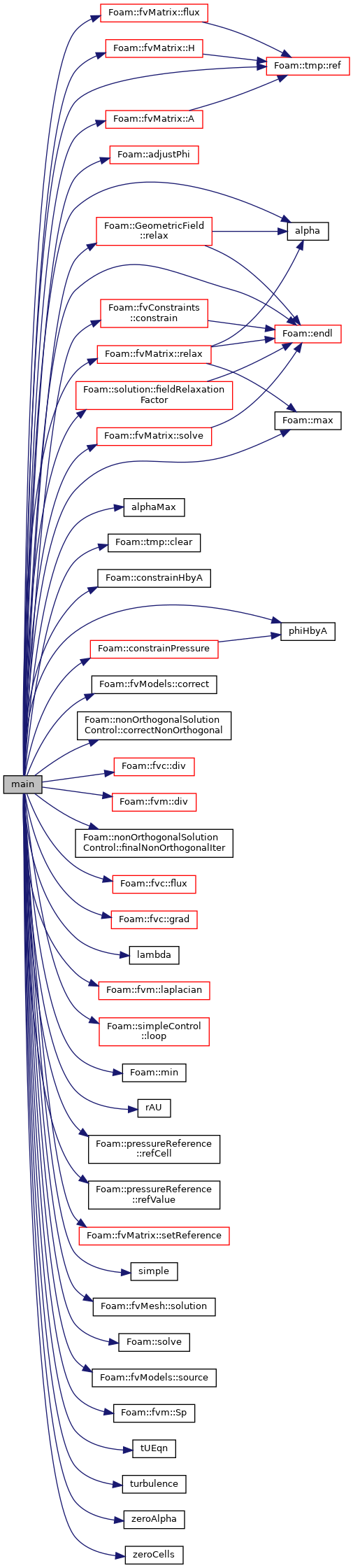 References fvMatrix< Type >::A(), Foam::adjustPhi(), alpha(), alphaMax(), tmp< T >::clear(), fvConstraints::constrain(), Foam::constrainHbyA(), Foam::constrainPressure(), fvModels::correct(), nonOrthogonalSolutionControl::correctNonOrthogonal(), Foam::fvc::div(), Foam::fvm::div(), Foam::endl(), solution::fieldRelaxationFactor(), nonOrthogonalSolutionControl::finalNonOrthogonalIter(), fvMatrix< Type >::flux(), Foam::fvc::flux(), Foam::fvc::grad(), fvMatrix< Type >::H(), HbyA, Foam::Info, inletCells, lambda(), Foam::fvm::laplacian(), simpleControl::loop(), Foam::max(), mesh, Foam::min(), Foam::nl, p, phiHbyA(), rAU(), tmp< T >::ref(), pressureReference::refCell(), pressureReference::refValue(), fvMatrix< Type >::relax(), GeometricField< Type, GeoMesh, PrimitiveField >::relax(), fvMatrix< Type >::setReference(), simple(), fvMesh::solution(), fvMatrix< Type >::solve(), Foam::solve(), fvModels::source(), Foam::fvm::Sp(), tUEqn(), turbulence(), U, UEqn, zeroAlpha(), and zeroCells().