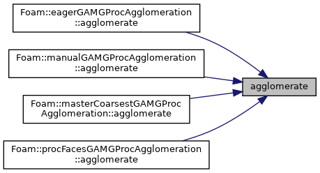 Implemented in procFacesGAMGProcAgglomeration, noneGAMGProcAgglomeration, masterCoarsestGAMGProcAgglomeration, manualGAMGProcAgglomeration, and eagerGAMGProcAgglomeration.