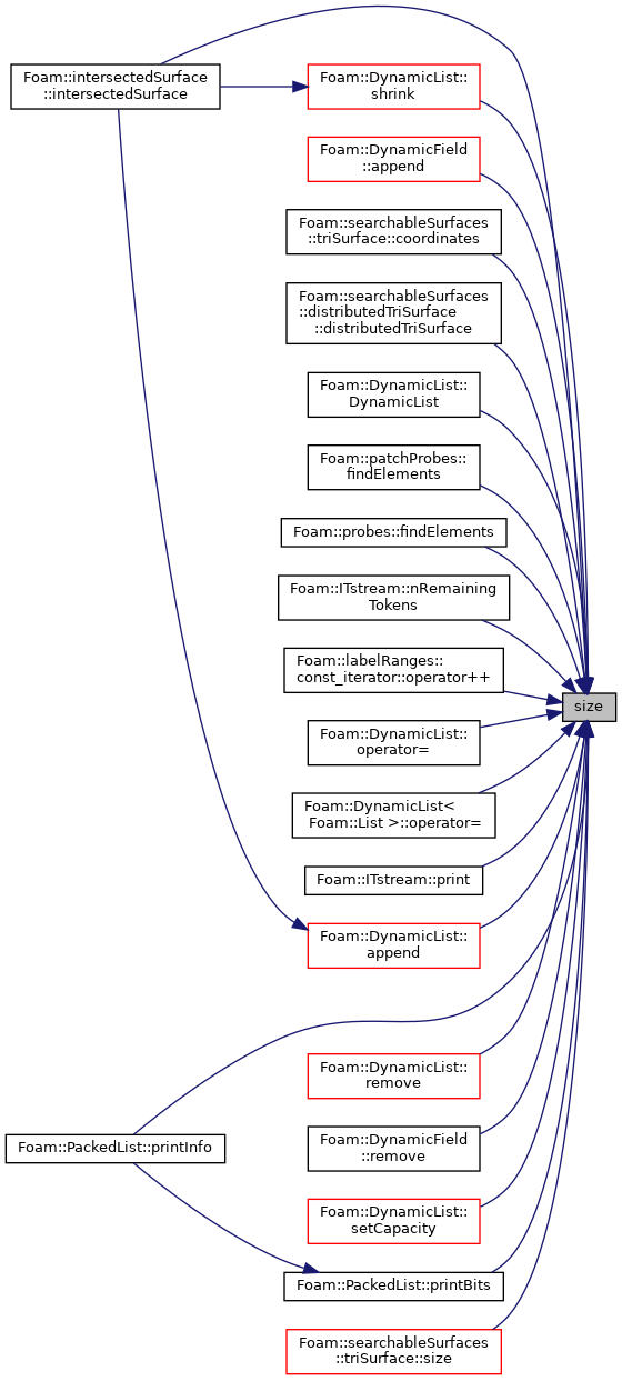 Referenced by DynamicList< T, SizeInc, SizeMult, SizeDiv >::append(), DynamicField< T, SizeInc, SizeMult, SizeDiv >::append(), triSurface::coordinates(), distributedTriSurface::distributedTriSurface(), DynamicList< T, SizeInc, SizeMult, SizeDiv >::DynamicList(), patchProbes::findElements(), probes::findElements(), intersectedSurface::intersectedSurface(), ITstream::nRemainingTokens(), labelRanges::const_iterator::operator++(), DynamicList< T, SizeInc, SizeMult, SizeDiv >::operator=(), DynamicList< Foam::List >::operator=(), ITstream::print(), PackedList< nBits >::printBits(), PackedList< nBits >::printInfo(), DynamicList< T, SizeInc, SizeMult, SizeDiv >::remove(), DynamicField< T, SizeInc, SizeMult, SizeDiv >::remove(), DynamicList< T, SizeInc, SizeMult, SizeDiv >::setCapacity(), DynamicList< T, SizeInc, SizeMult, SizeDiv >::shrink(), and triSurface::size().