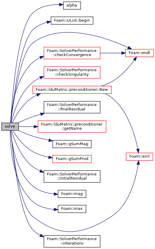 References alpha(), UList< T >::begin(), SolverPerformance< Type >::checkConvergence(), SolverPerformance< Type >::checkSingularity(), Foam::endl(), Foam::exit(), Foam::FatalError, FatalErrorInFunction, SolverPerformance< Type >::finalResidual(), lduMatrix::preconditioner::getName(), Foam::gSumMag(), Foam::gSumProd(), Foam::Info, SolverPerformance< Type >::initialResidual(), Foam::mag(), Foam::max(), mesh, lduMatrix::preconditioner::New(), SolverPerformance< Type >::nIterations(), Foam::nl, and psi.