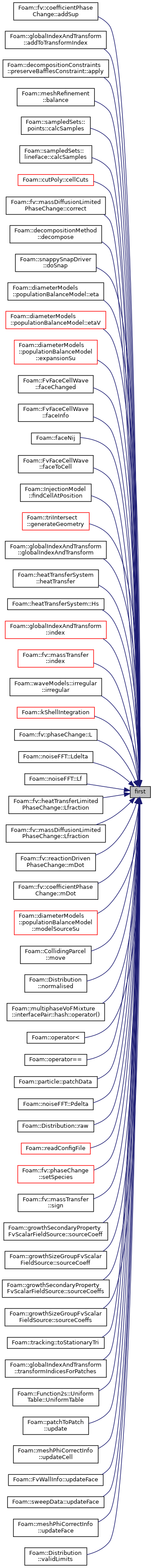 Referenced by globalIndexAndTransform::addToTransformIndex(), preserveBafflesConstraint::apply(), meshRefinement::balance(), points::calcSamples(), lineFace::calcSamples(), Foam::cutPoly::cellCuts(), homogeneousCondensation::correct(), homogeneousLiquidPhaseSeparation::correct(), massDiffusionLimitedPhaseChange::correct(), decompositionMethod::decompose(), snappySnapDriver::doSnap(), populationBalanceModel::eta(), populationBalanceModel::etaV(), populationBalanceModel::expansionSu(), FvFaceCellWave< Type, TrackingData >::faceChanged(), FvFaceCellWave< Type, TrackingData >::faceInfo(), Foam::faceNij(), FvFaceCellWave< Type, TrackingData >::faceToCell(), InjectionModel< CloudType >::findCellAtPosition(), Foam::triIntersect::generateGeometry(), heatTransferSystem::heatTransfer(), heatTransferSystem::Hs(), massTransfer::index(), irregular::irregular(), Foam::kShellIntegration(), phaseChange::L(), noiseFFT::Ldelta(), noiseFFT::Lf(), heatTransferLimitedPhaseChange::Lfraction(), massDiffusionLimitedPhaseChange::Lfraction(), noiseFFT::Lsum(), reactionDrivenPhaseChange::mDot(), populationBalanceModel::modelSourceSu(), CollidingParcel< ParcelType >::move(), Distribution< Type >::normalised(), multiphaseVoFMixture::interfacePair::hash::operator()(), Foam::operator<(), Foam::operator==(), particle::patchData(), noiseFFT::Pdelta(), globalIndexAndTransform::processor(), Distribution< Type >::raw(), Foam::readConfigFile(), phaseChange::setSpecies(), massTransfer::sign(), growthSecondaryPropertyFvScalarFieldSource::sourceCoeff(), growthSizeGroupFvScalarFieldSource::sourceCoeff(), growthSecondaryPropertyFvScalarFieldSource::sourceCoeffs(), growthSizeGroupFvScalarFieldSource::sourceCoeffs(), Foam::tracking::toStationaryTri(), globalIndexAndTransform::transformIndex(), globalIndexAndTransform::transformIndicesForPatches(), UniformTable< Type >::UniformTable(), patchToPatch::update(), meshPhiCorrectInfo::updateCell(), FvWallInfo< WallLocation >::updateFace(), sweepData::updateFace(), meshPhiCorrectInfo::updateFace(), and Distribution< Type >::validLimits().
