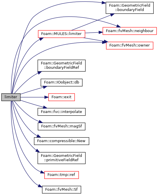 References GeometricField< Type, GeoMesh, PrimitiveField >::boundaryField(), GeometricField< Type, GeoMesh, PrimitiveField >::boundaryFieldRef(), IOobject::db(), Foam::dimless, Foam::dimMassFlux, Foam::dimVolumetricFlux, Foam::exit(), Foam::FatalError, FatalErrorInFunction, forAll, Foam::fvc::interpolate(), Foam::MULES::limiter(), fvMesh::magSf(), mesh, fvMesh::neighbour(), Foam::compressible::New(), fvMesh::owner(), patchi, GeometricField< Type, GeoMesh, PrimitiveField >::primitiveFieldRef(), tmp< T >::ref(), rho, and fvMesh::Sf().