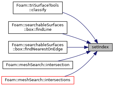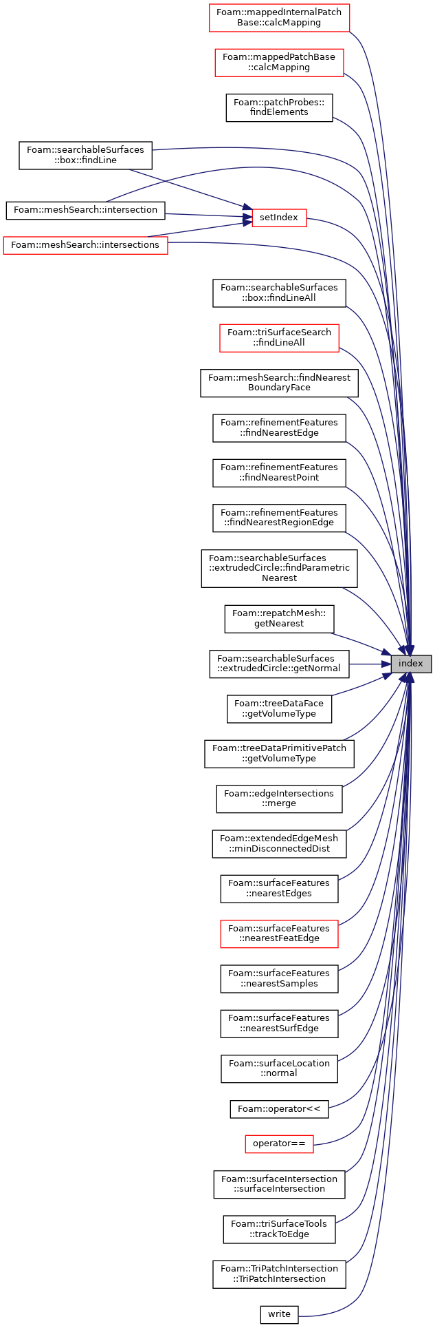 Referenced by mappedInternalPatchBase::calcMapping(), mappedPatchBase::calcMapping(), patchProbes::findElements(), box::findLine(), box::findLineAll(), triSurfaceSearch::findLineAll(), meshSearch::findNearestBoundaryFace(), refinementFeatures::findNearestEdge(), refinementFeatures::findNearestPoint(), refinementFeatures::findNearestRegionEdge(), extrudedCircle::findParametricNearest(), repatchMesh::getNearest(), extrudedCircle::getNormal(), treeDataFace::getVolumeType(), treeDataPrimitivePatch< PatchType >::getVolumeType(), meshSearch::intersection(), meshSearch::intersections(), edgeIntersections::merge(), extendedEdgeMesh::minDisconnectedDist(), surfaceFeatures::nearestEdges(), surfaceFeatures::nearestFeatEdge(), surfaceFeatures::nearestSamples(), surfaceFeatures::nearestSurfEdge(), surfaceLocation::normal(), Foam::operator<<(), PointIndexHit< Point >::operator==(), PointIndexHit< Point >::setIndex(), surfaceIntersection::surfaceIntersection(), triSurfaceTools::trackToEdge(), TriPatchIntersection< SrcPatchType, TgtPatchType >::TriPatchIntersection(), and PointIndexHit< Point >::write().