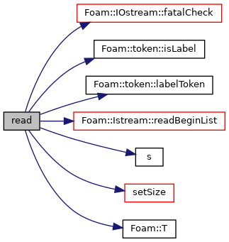 References IOstream::fatalCheck(), forAll, token::isLabel(), token::labelToken(), Istream::readBeginList(), s(), setSize(), and Foam::T().