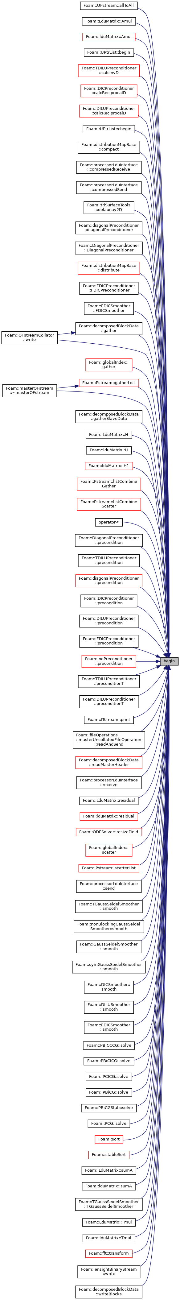 Referenced by UPstream::allToAll(), LduMatrix< Type, DType, LUType >::Amul(), lduMatrix::Amul(), UPtrList< T >::begin(), TDILUPreconditioner< Type, DType, LUType >::calcInvD(), DICPreconditioner::calcReciprocalD(), DILUPreconditioner::calcReciprocalD(), UPtrList< T >::cbegin(), distributionMapBase::compact(), processorLduInterface::compressedReceive(), processorLduInterface::compressedSend(), triSurfaceTools::delaunay2D(), diagonalPreconditioner::diagonalPreconditioner(), DiagonalPreconditioner< Type, DType, LUType >::DiagonalPreconditioner(), distributionMapBase::distribute(), FDICPreconditioner::FDICPreconditioner(), FDICSmoother::FDICSmoother(), decomposedBlockData::gather(), globalIndex::gather(), Pstream::gatherList(), decomposedBlockData::gatherSlaveData(), LduMatrix< Type, DType, LUType >::H(), lduMatrix::H(), lduMatrix::H1(), Pstream::listCombineGather(), Pstream::listCombineScatter(), UList< T >::operator<(), DiagonalPreconditioner< Type, DType, LUType >::precondition(), TDILUPreconditioner< Type, DType, LUType >::precondition(), diagonalPreconditioner::precondition(), DICPreconditioner::precondition(), DILUPreconditioner::precondition(), FDICPreconditioner::precondition(), noPreconditioner::precondition(), TDILUPreconditioner< Type, DType, LUType >::preconditionT(), DILUPreconditioner::preconditionT(), ITstream::print(), masterUncollatedFileOperation::readAndSend(), decomposedBlockData::readMasterHeader(), processorLduInterface::receive(), LduMatrix< Type, DType, LUType >::residual(), lduMatrix::residual(), ODESolver::resizeField(), globalIndex::scatter(), Pstream::scatterList(), processorLduInterface::send(), TGaussSeidelSmoother< Type, DType, LUType >::smooth(), nonBlockingGaussSeidelSmoother::smooth(), GaussSeidelSmoother::smooth(), symGaussSeidelSmoother::smooth(), DICSmoother::smooth(), DILUSmoother::smooth(), FDICSmoother::smooth(), PBiCCCG< Type, DType, LUType >::solve(), PBiCICG< Type, DType, LUType >::solve(), PCICG< Type, DType, LUType >::solve(), PBiCG::solve(), PBiCGStab::solve(), PCG::solve(), Foam::sort(), Foam::stableSort(), LduMatrix< Type, DType, LUType >::sumA(), lduMatrix::sumA(), TGaussSeidelSmoother< Type, DType, LUType >::TGaussSeidelSmoother(), LduMatrix< Type, DType, LUType >::Tmul(), lduMatrix::Tmul(), fft::transform(), ensightBinaryStream::write(), OFstreamCollator::write(), decomposedBlockData::writeBlocks(), and masterOFstream::~masterOFstream().