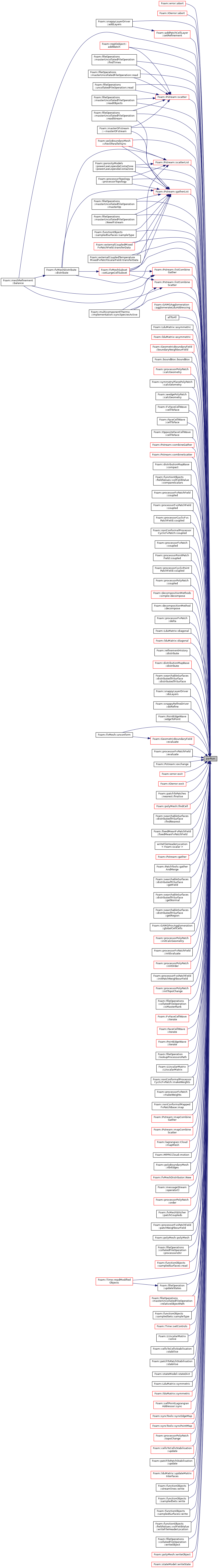 Referenced by error::abort(), IOerror::abort(), snappyLayerDriver::addLayers(), regIOobject::addWatch(), GAMGAgglomeration::agglomerateLduAddressing(), UPstream::allToAll(), LduMatrix< Type, DType, LUType >::asymmetric(), lduMatrix::asymmetric(), meshRefinement::balance(), GeometricBoundaryField< Type, GeoMesh, PrimitiveField >::boundaryNeighbourField(), boundBox::boundBox(), processorPolyPatch::calcGeometry(), symmetryPlanePolyPatch::calcGeometry(), wedgePolyPatch::calcGeometry(), FvFaceCellWave< Type, TrackingData >::cellToFace(), FaceCellWave< Type, TrackingData >::cellToFace(), OppositeFaceCellWave< Type, TrackingData >::cellToFace(), polyBoundaryMesh::checkParallelSync(), Pstream::combineGather(), Pstream::combineScatter(), distributionMapBase::compact(), volFieldValue::compareScalars(), processorFvPatchField< Type >::coupled(), processorFvsPatchField< Type >::coupled(), processorCyclicFvsPatchField< Type >::coupled(), nonConformalProcessorCyclicFvPatch::coupled(), processorFvPatch::coupled(), processorPointPatchField< Type >::coupled(), processorCyclicPointPatchField< Type >::coupled(), processorPolyPatch::coupled(), simple::decompose(), decompositionMethod::decompose(), processorFvPatch::delta(), LduMatrix< Type, DType, LUType >::diagonal(), lduMatrix::diagonal(), fvMeshDistribute::distribute(), refinementHistory::distribute(), distributionMapBase::distribute(), distributedTriSurface::distributedTriSurface(), snappyLayerDriver::doLayers(), snappyRefineDriver::doRefine(), PointEdgeWave< Type, TrackingData >::edgeToPoint(), GeometricBoundaryField< Type, GeoMesh, PrimitiveField >::evaluate(), processorFvPatchField< Type >::evaluate(), Pstream::exchange(), error::exit(), IOerror::exit(), nearest::finalise(), polyMesh::findCell(), distributedTriSurface::findNearest(), masterUncollatedFileOperation::findTimes(), fixedMeanFvPatchField< Type >::fixedMeanFvPatchField(), Foam::functionObjects::fieldValues::volFieldValue::writeFileHeaderLocation< Foam::scalar >(), Pstream::gather(), PatchTools::gatherAndMerge(), Pstream::gatherList(), distributedTriSurface::getField(), distributedTriSurface::getNormal(), distributedTriSurface::getRegion(), GAMGProcAgglomeration::globalCellCells(), processorPolyPatch::initCalcGeometry(), processorFvPatchField< Type >::initEvaluate(), processorPolyPatch::initOrder(), processorFvsPatchField< Type >::initPatchNeighbourField(), processorPolyPatch::initTopoChange(), collatedFileOperation::isMasterRank(), FvFaceCellWave< Type, TrackingData >::iterate(), FaceCellWave< Type, TrackingData >::iterate(), PointEdgeWave< Type, TrackingData >::iterate(), Pstream::listCombineGather(), Pstream::listCombineScatter(), fileOperation::lookupProcessorsPath(), LUscalarMatrix::LUscalarMatrix(), nonConformalProcessorCyclicFvPatch::makeWeights(), processorFvPatch::makeWeights(), nonConformalMappedFvPatchBase::map(), Pstream::mapCombineGather(), Pstream::mapCombineScatter(), Cloud< ParticleType >::mapMesh(), masterUncollatedFileOperation::masterOp(), MPPICCloud< CloudType >::motion(), polyBoundaryMesh::nbrEdges(), fvMeshDistributor::New(), masterUncollatedFileOperation::NewIFstream(), messageStream::operator()(), processorPolyPatch::order(), fvMeshStitcher::patchCoupleds(), processorFvsPatchField< Type >::patchNeighbourField(), polyMesh::polyMesh(), powerLawLopesdaCostaZone::powerLawLopesdaCostaZone(), collatedFileOperation::processorsDir(), processorTopology::processorTopology(), sampledSurfaces::read(), masterUncollatedFileOperation::read(), uncollatedFileOperation::read(), Time::readModifiedObjects(), masterUncollatedFileOperation::readObjects(), masterUncollatedFileOperation::readStream(), masterUncollatedFileOperation::relativeObjectPath(), sampledSets::sampleType(), sampledSurfaces::sampleType(), Pstream::scatter(), Pstream::scatterList(), Time::setControls(), fvMeshSubset::setLargeCellSubset(), addPatchCellLayer::setRefinement(), LUscalarMatrix::solve(), cellsToCellsStabilisation::stabilise(), patchToPatchStabilisation::stabilise(), stateModel::stateDict(), LduMatrix< Type, DType, LUType >::symmetric(), lduMatrix::symmetric(), cellPointLagrangianAddressor::sync(), syncTools::syncEdgeMap(), syncTools::syncPointMap(), multicomponentThermo::implementation::syncSpeciesActive(), processorPolyPatch::topoChange(), externalCoupledMixedFvPatchField< Type >::transferData(), externalCoupledTemperatureMixedFvPatchScalarField::transferData(), fvMesh::unconform(), cellsToCellsStabilisation::update(), patchToPatchStabilisation::update(), lduMatrix::updateMatrixInterfaces(), fileOperation::updateStates(), streamlines::write(), sampledSets::write(), sampledSurfaces::write(), volFieldValue::writeFileHeaderLocation(), collatedFileOperation::writeObject(), polyMesh::writeObject(), stateModel::writeState(), and masterOFstream::~masterOFstream().
