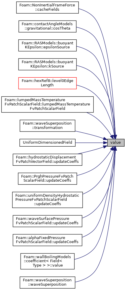 Referenced by NonInertialFrameForce< CloudType >::cacheFields(), gravitational::cosTheta(), buoyantKEpsilon< BasicMomentumTransportModel >::epsilonSource(), buoyantKEpsilon< BasicMomentumTransportModel >::kSource(), hexRef8::level0EdgeLength(), lumpedMassTemperatureFvPatchScalarField::lumpedMassTemperatureFvPatchScalarField(), waveSuperposition::transformation(), UniformDimensionedField< Type >::UniformDimensionedField(), hydrostaticDisplacementFvPatchVectorField::updateCoeffs(), PrghPressureFvPatchScalarField< PressureFvPatchScalarField >::updateCoeffs(), uniformDensityHydrostaticPressureFvPatchScalarField::updateCoeffs(), waveSurfacePressureFvPatchScalarField::updateCoeffs(), alphaFixedPressureFvPatchScalarField::updateCoeffs(), coefficient< Field< Type > >::value(), and waveSuperposition::waveSuperposition().