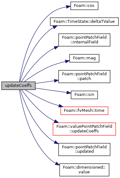 References Foam::cos(), TimeState::deltaTValue(), pointPatchField< Type >::internalField(), Foam::mag(), mesh, Field< vector >::operator, p, pointPatchField< Type >::patch(), Foam::sin(), fvMesh::time(), valuePointPatchField< Type >::updateCoeffs(), pointPatchField< Type >::updated(), and dimensioned< Type >::value().