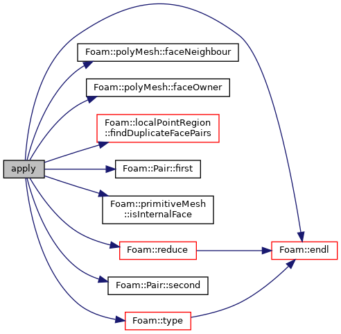 References Foam::endl(), polyMesh::faceNeighbour(), polyMesh::faceOwner(), localPointRegion::findDuplicateFacePairs(), Pair< Type >::first(), forAll, Foam::Info, primitiveMesh::isInternalFace(), mesh, Foam::reduce(), Pair< Type >::second(), and Foam::type().