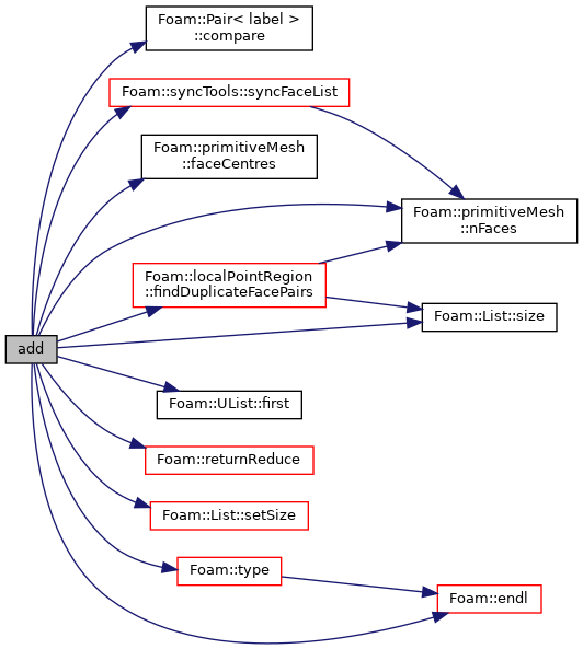 References Pair< label >::compare(), Foam::endl(), primitiveMesh::faceCentres(), localPointRegion::findDuplicateFacePairs(), UList< T >::first(), forAll, Foam::Info, mesh, n, primitiveMesh::nFaces(), p, Foam::returnReduce(), List< T >::setSize(), List< T >::size(), syncTools::syncFaceList(), Foam::type(), and WarningInFunction.