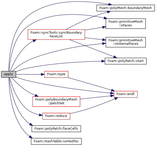 References polyMesh::boundaryMesh(), Foam::endl(), forAll, Foam::Info, mesh, primitiveMesh::nFaces(), polyBoundaryMesh::patchSet(), Foam::reduce(), List< T >::setSize(), HashTable< T, Key, Hash >::sortedToc(), polyPatch::start(), syncTools::syncFaceList(), and Foam::type().