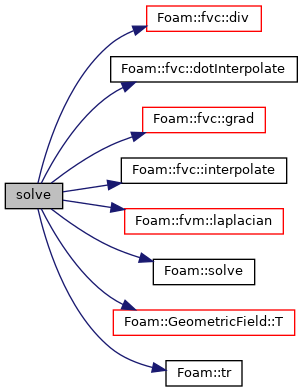 References Foam::fvc::div(), Foam::fvc::dotInterpolate(), Foam::fvc::grad(), Foam::fvc::interpolate(), Foam::fvm::laplacian(), Foam::solve(), GeometricField< Type, GeoMesh, PrimitiveField >::T(), and Foam::tr().
