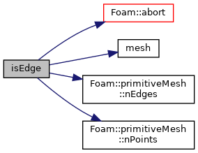 References Foam::abort(), Foam::FatalError, FatalErrorInFunction, edgeVertex::isEdge(), and edgeVertex::mesh().