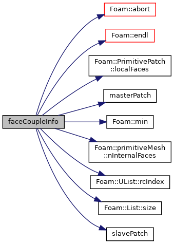 References Foam::abort(), Foam::endl(), Foam::FatalError, FatalErrorInFunction, forAll, PrimitivePatch< FaceList, PointField >::localFaces(), faceCoupleInfo::masterPatch(), Foam::min(), primitiveMesh::nInternalFaces(), Foam::nl, nPoints, UList< T >::rcIndex(), List< T >::size(), and faceCoupleInfo::slavePatch().