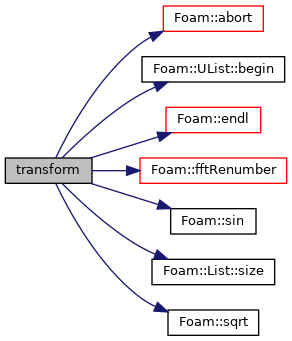 References Foam::abort(), UList< T >::begin(), Foam::endl(), Foam::FatalError, FatalErrorInFunction, Foam::fftRenumber(), forAll, fft::FORWARD_TRANSFORM, n, fft::REVERSE_TRANSFORM, Foam::sin(), List< T >::size(), Foam::sqrt(), SWAP, and TWOPI.