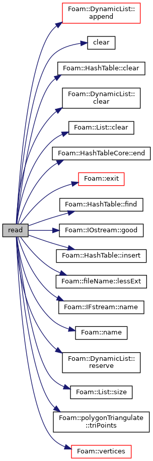 References DynamicList< T, SizeInc, SizeMult, SizeDiv >::append(), clear(), HashTable< T, Key, Hash >::clear(), DynamicList< T, SizeInc, SizeMult, SizeDiv >::clear(), List< T >::clear(), HashTableCore::end(), Foam::exit(), Foam::FatalError, FatalErrorInFunction, HashTable< T, Key, Hash >::find(), forAll, IOstream::good(), HashTable< T, Key, Hash >::insert(), fileName::lessExt(), IFstream::name(), Foam::name(), points, DynamicList< T, SizeInc, SizeMult, SizeDiv >::reserve(), List< T >::size(), polygonTriangulate::triPoints(), and Foam::vertices().