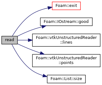 References Foam::exit(), Foam::FatalError, FatalErrorInFunction, forAll, IOstream::good(), vtkUnstructuredReader::lines(), IOobject::NO_READ, IOobject::NO_WRITE, vtkUnstructuredReader::points(), and List< T >::size().