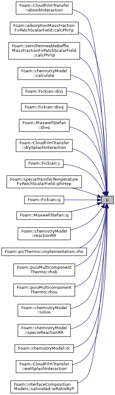 Referenced by CloudFilmTransfer< CloudType >::absorbInteraction(), adsorptionMassFractionFvPatchScalarField::calcPhiYp(), semiPermeableBaffleMassFractionFvPatchScalarField::calcPhiYp(), chemistryModel< ThermoType >::calculate(), Fickian< BasicThermophysicalTransportModel >::divj(), Fickian< BasicThermophysicalTransportModel >::divq(), MaxwellStefan< BasicThermophysicalTransportModel >::divq(), CloudFilmTransfer< CloudType >::drySplashInteraction(), Fickian< BasicThermophysicalTransportModel >::j(), specieTransferTemperatureFvPatchScalarField::phiHep(), Fickian< BasicThermophysicalTransportModel >::q(), MaxwellStefan< BasicThermophysicalTransportModel >::q(), chemistryModel< ThermoType >::reactionRR(), psiThermo::implementation::rho(), psiuMulticomponentThermo::rhob(), psiuMulticomponentThermo::rhou(), chemistryModel< ThermoType >::solve(), chemistryModel< ThermoType >::specieReactionRR(), chemistryModel< ThermoType >::tc(), CloudFilmTransfer< CloudType >::wetSplashInteraction(), and saturated::wRatioByP().