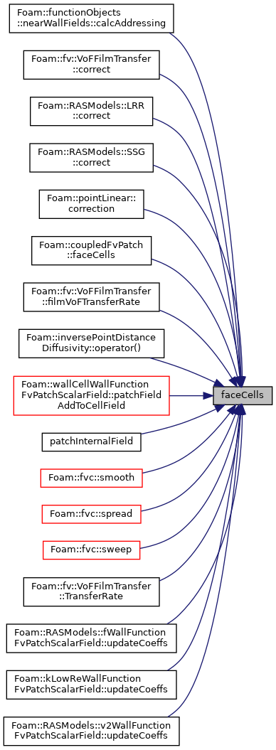 Referenced by nearWallFields::calcAddressing(), VoFFilmTransfer::correct(), LRR< BasicMomentumTransportModel >::correct(), SSG< BasicMomentumTransportModel >::correct(), pointLinear< Type >::correction(), coupledFvPatch::faceCells(), VoFFilmTransfer::filmVoFTransferRate(), inversePointDistanceDiffusivity::operator()(), wallCellWallFunctionFvPatchScalarField::patchFieldAddToCellField(), fvPatch::patchInternalField(), Foam::fvc::smooth(), Foam::fvc::spread(), Foam::fvc::sweep(), VoFFilmTransfer::TransferRate(), fWallFunctionFvPatchScalarField::updateCoeffs(), kLowReWallFunctionFvPatchScalarField::updateCoeffs(), and v2WallFunctionFvPatchScalarField::updateCoeffs().