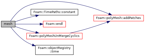 References polyMesh::addPatches(), TimePaths::constant(), polyMesh::defaultRegion, Foam::endl(), Foam::Info, mesh, Foam::polyMeshUnMergeCyclics(), and objectRegistry::time().