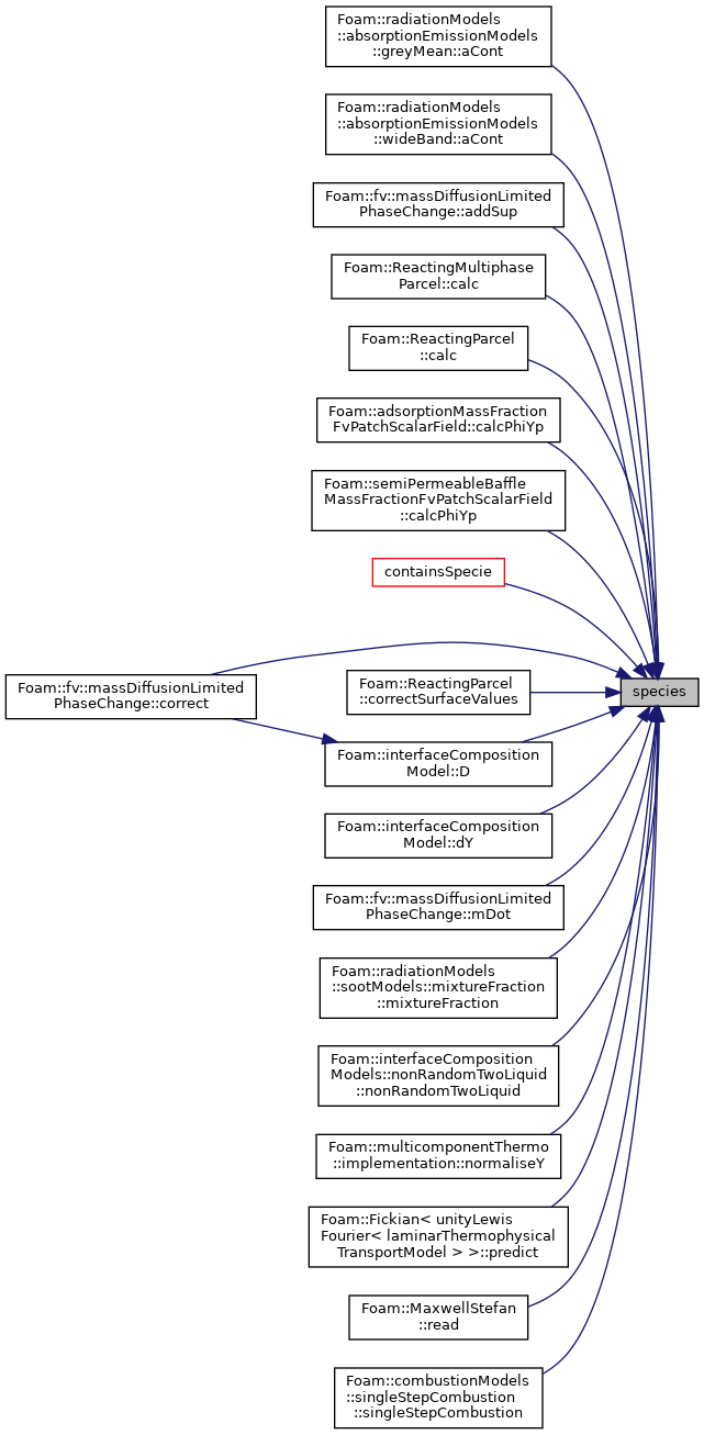 Referenced by greyMean::aCont(), wideBand::aCont(), massDiffusionLimitedPhaseChange::addSup(), ReactingMultiphaseParcel< ParcelType >::calc(), ReactingParcel< ParcelType >::calc(), adsorptionMassFractionFvPatchScalarField::calcPhiYp(), semiPermeableBaffleMassFractionFvPatchScalarField::calcPhiYp(), multicomponentThermo::containsSpecie(), massDiffusionLimitedPhaseChange::correct(), ReactingParcel< ParcelType >::correctSurfaceValues(), interfaceCompositionModel::D(), interfaceCompositionModel::dY(), massDiffusionLimitedPhaseChange::mDot(), mixtureFraction::mixtureFraction(), nonRandomTwoLiquid::nonRandomTwoLiquid(), multicomponentThermo::implementation::normaliseY(), Fickian< unityLewisFourier< laminarThermophysicalTransportModel > >::predict(), MaxwellStefan< BasicThermophysicalTransportModel >::read(), and singleStepCombustion::singleStepCombustion().