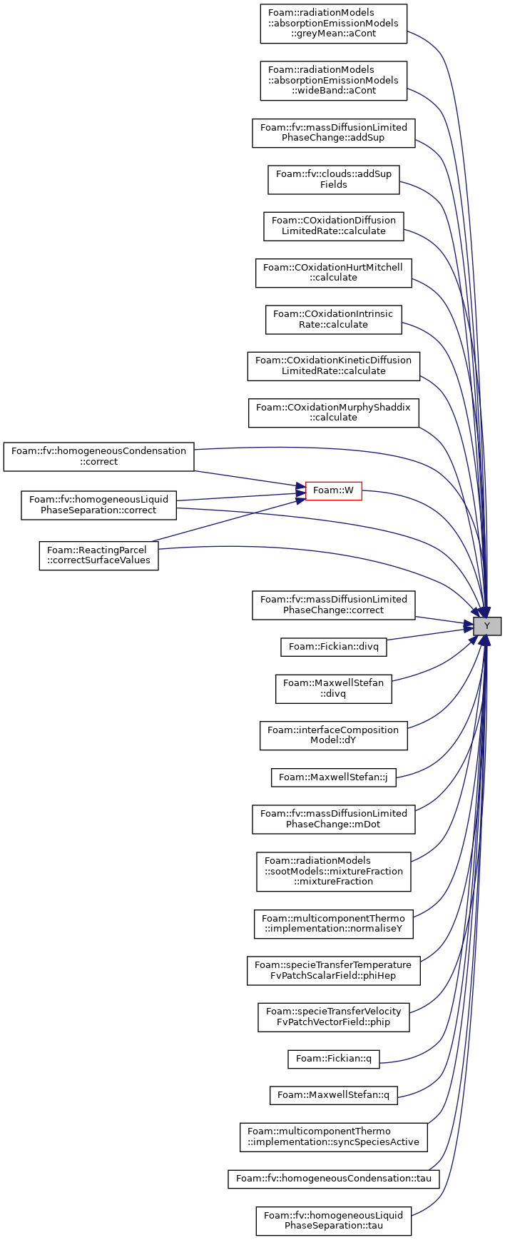 Referenced by greyMean::aCont(), wideBand::aCont(), massDiffusionLimitedPhaseChange::addSup(), clouds::addSupFields(), COxidationDiffusionLimitedRate< CloudType >::calculate(), COxidationHurtMitchell< CloudType >::calculate(), COxidationIntrinsicRate< CloudType >::calculate(), COxidationKineticDiffusionLimitedRate< CloudType >::calculate(), COxidationMurphyShaddix< CloudType >::calculate(), homogeneousCondensation::correct(), homogeneousLiquidPhaseSeparation::correct(), massDiffusionLimitedPhaseChange::correct(), ReactingParcel< ParcelType >::correctSurfaceValues(), Fickian< BasicThermophysicalTransportModel >::divq(), MaxwellStefan< BasicThermophysicalTransportModel >::divq(), interfaceCompositionModel::dY(), MaxwellStefan< BasicThermophysicalTransportModel >::j(), massDiffusionLimitedPhaseChange::mDot(), mixtureFraction::mixtureFraction(), multicomponentThermo::implementation::normaliseY(), specieTransferTemperatureFvPatchScalarField::phiHep(), specieTransferVelocityFvPatchVectorField::phip(), Fickian< BasicThermophysicalTransportModel >::q(), MaxwellStefan< BasicThermophysicalTransportModel >::q(), multicomponentThermo::implementation::syncSpeciesActive(), homogeneousCondensation::tau(), homogeneousLiquidPhaseSeparation::tau(), and Foam::W().