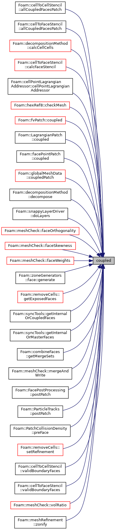 Referenced by cellToCellStencil::allCoupledFacesPatch(), cellToFaceStencil::allCoupledFacesPatch(), decompositionMethod::calcCellCells(), cellToFaceStencil::calcFaceStencil(), cellPointLagrangianAddressor::cellPointLagrangianAddressor(), hexRef8::checkMesh(), fvPatch::coupled(), LagrangianPatch::coupled(), facePointPatch::coupled(), globalMeshData::coupledPatch(), decompositionMethod::decompose(), snappyLayerDriver::doLayers(), Foam::meshCheck::faceOrthogonality(), Foam::meshCheck::faceSkewness(), Foam::meshCheck::faceWeights(), face::generate(), removeCells::getExposedFaces(), syncTools::getInternalOrCoupledFaces(), syncTools::getInternalOrMasterFaces(), combineFaces::getMergeSets(), Foam::meshCheck::mergeAndWrite(), FacePostProcessing< CloudType >::postPatch(), ParticleTracks< CloudType >::postPatch(), PatchCollisionDensity< CloudType >::preFace(), removeCells::setRefinement(), cellToCellStencil::validBoundaryFaces(), cellToFaceStencil::validBoundaryFaces(), Foam::meshCheck::volRatio(), and meshRefinement::zonify().