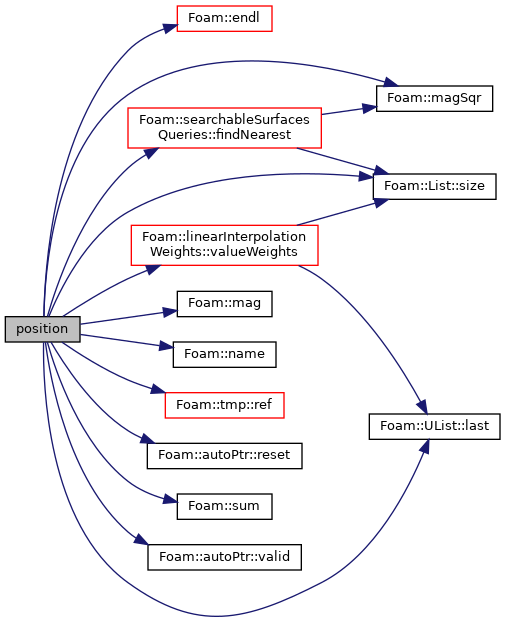 References Foam::e, Foam::endl(), searchableSurfacesQueries::findNearest(), forAll, Foam::Info, UList< T >::last(), Foam::mag(), Foam::magSqr(), Foam::name(), points, Foam::Pout, tmp< T >::ref(), autoPtr< T >::reset(), List< T >::size(), Foam::sum(), autoPtr< T >::valid(), linearInterpolationWeights::valueWeights(), and VectorSpace< Form, Cmpt, Ncmpts >::zero.