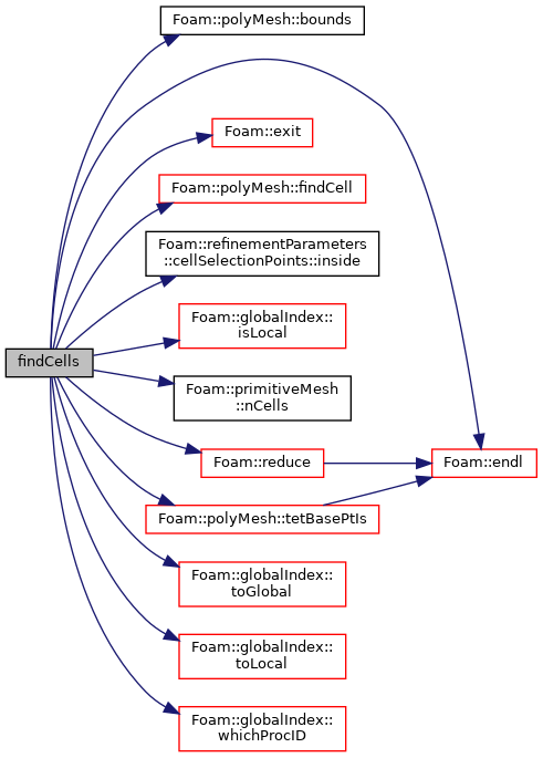 References polyMesh::bounds(), Foam::endl(), Foam::exit(), Foam::FatalError, FatalErrorInFunction, polyMesh::findCell(), forAll, Foam::Info, refinementParameters::cellSelectionPoints::inside(), globalIndex::isLocal(), mesh, primitiveMesh::nCells(), Foam::nl, Foam::reduce(), polyMesh::tetBasePtIs(), globalIndex::toGlobal(), globalIndex::toLocal(), and globalIndex::whichProcID().