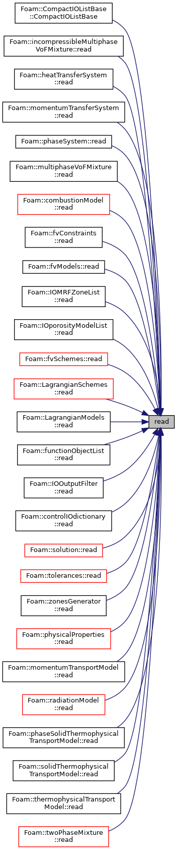 Referenced by CompactIOListBase< Container, IOContainer, CompactIOContainer, Type >::CompactIOListBase(), incompressibleMultiphaseVoFMixture::read(), heatTransferSystem::read(), momentumTransferSystem::read(), phaseSystem::read(), multiphaseVoFMixture::read(), combustionModel::read(), fvConstraints::read(), fvModels::read(), IOMRFZoneList::read(), IOporosityModelList::read(), fvSchemes::read(), LagrangianSchemes::read(), LagrangianModels::read(), functionObjectList::read(), IOOutputFilter< OutputFilter >::read(), controlIOdictionary::read(), solution::read(), tolerances::read(), zonesGenerator::read(), physicalProperties::read(), momentumTransportModel::read(), radiationModel::read(), phaseSolidThermophysicalTransportModel::read(), solidThermophysicalTransportModel::read(), thermophysicalTransportModel::read(), and twoPhaseMixture::read().