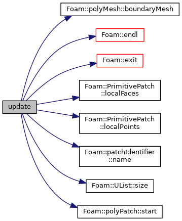 References polyMesh::boundaryMesh(), Foam::endl(), Foam::exit(), Foam::FatalError, FatalErrorInFunction, forAll, PrimitivePatch< FaceList, PointField >::localFaces(), PrimitivePatch< FaceList, PointField >::localPoints(), mesh, patchIdentifier::name(), patchi, points, Foam::Pout, UList< T >::size(), and polyPatch::start().