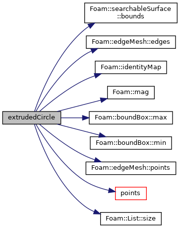 References searchableSurface::bounds(), edgeMesh::edges(), Foam::identityMap(), Foam::mag(), boundBox::max(), boundBox::min(), edgeMesh::points(), extrudedCircle::points(), and List< T >::size().