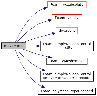 References Foam::fvc::absolute(), fluidSolver::correctPhi, Foam::fvc::div(), VoFSolver::divergent(), VoFSolver::divU, pimpleNoLoopControl::firstIter(), solver::mesh, solver::mesh_, fvMesh::move(), pimpleNoLoopControl::moveMeshOuterCorrectors(), VoFSolver::phi, solver::pimple, polyMesh::topoChanged(), and VoFSolver::U.