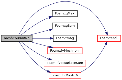 References checkMeshCourantNo, Foam::endl(), Foam::gMax(), Foam::gSum(), Foam::Info, Foam::mag(), mesh, fvMesh::phi(), Foam::fvc::surfaceSum(), and fvMesh::V().