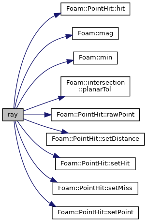 References PointHit< Point >::distance(), intersection::fullRay, PointHit< Point >::hit(), PointHit< Point >::hitPoint(), Foam::ln(), Foam::mag(), Foam::minDist(), PointHit< Point >::missPoint(), PointHit< Point >::setDistance(), PointHit< Point >::setHit(), PointHit< Point >::setMiss(), and PointHit< Point >::setPoint().