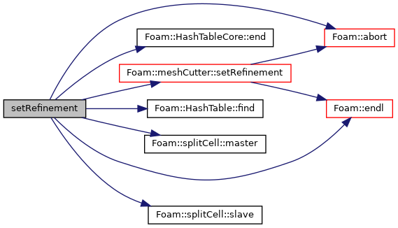 References Foam::abort(), HashTableCore::end(), Foam::endl(), Foam::FatalError, FatalErrorInFunction, HashTable< T, Key, Hash >::find(), forAllConstIter, splitCell::master(), Foam::Pout, meshCutter::setRefinement(), and splitCell::slave().