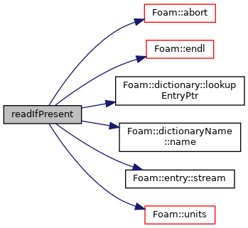 References Foam::abort(), dict, Foam::endl(), Foam::FatalIOError, FatalIOErrorInFunction, IOInfoInFunction, dictionary::lookupEntryPtr(), dictionaryName::name(), entry::stream(), Foam::units(), and dictionary::writeOptionalEntries.