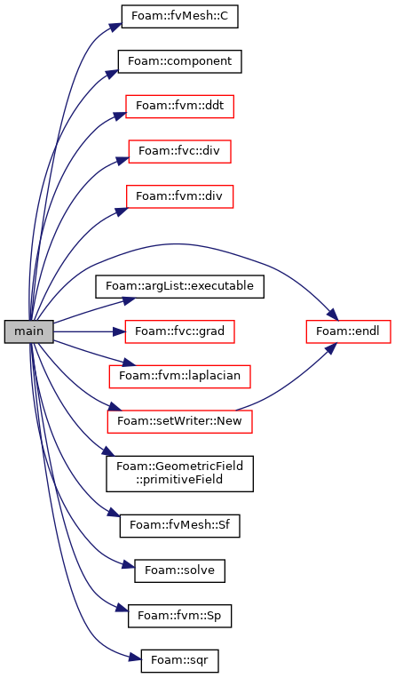 References args, fvMesh::C(), Foam::component(), Foam::fvm::ddt(), delta, Foam::fvc::div(), Foam::fvm::div(), Foam::endl(), argList::executable(), Foam::fvc::grad(), Foam::Info, Foam::fvm::laplacian(), mesh, setWriter::New(), Foam::nl, word::null, writeFile::outputPrefix, GeometricField< Type, GeoMesh, PrimitiveField >::primitiveField(), fvMesh::Sf(), Foam::solve(), Foam::fvm::Sp(), Foam::sqr(), and Vector< scalar >::X.