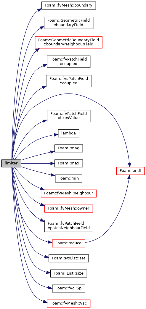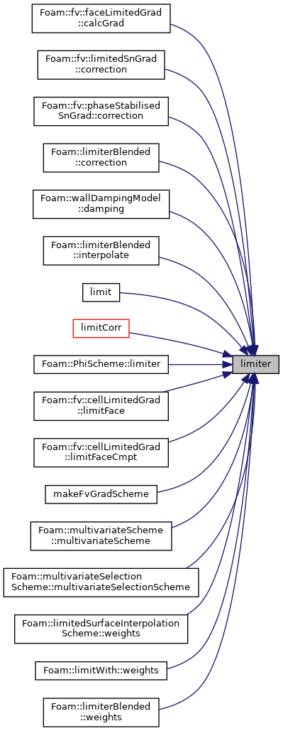 Referenced by faceLimitedGrad< Type >::calcGrad(), limitedSnGrad< Type >::correction(), phaseStabilisedSnGrad< Type >::correction(), limiterBlended< Type >::correction(), wallDampingModel::damping(), limiterBlended< Type >::interpolate(), limit(), limitCorr(), PhiScheme< Type, PhiLimiter >::limiter(), cellLimitedGrad< Type, Limiter >::limitFace(), cellLimitedGrad< Type, Limiter >::limitFaceCmpt(), makeFvGradScheme(), multivariateScheme< Type, Scheme >::multivariateScheme(), multivariateSelectionScheme< Type >::multivariateSelectionScheme(), limitedSurfaceInterpolationScheme< Type >::weights(), limitWith< Type >::weights(), and limiterBlended< Type >::weights().