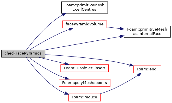 | bool | checkFacePyramids (const bool report, const scalar minPyrVol, const polyMesh &, const vectorField &cellCentres, const pointField &p, const labelList &checkFaces, const List< labelPair > &baffles, labelHashSet *) |