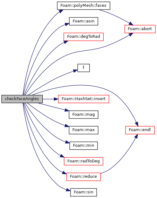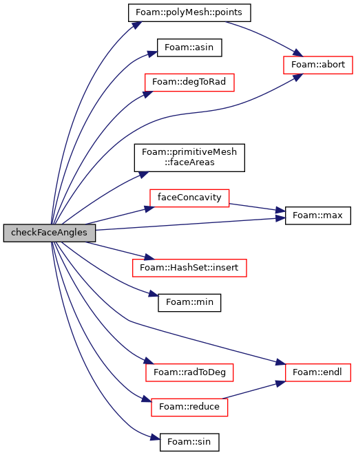 References Foam::abort(), Foam::asin(), Foam::degToRad(), Foam::endl(), primitiveMesh::faceAreas(), faceConcavity(), Foam::FatalError, FatalErrorInFunction, forAll, Foam::Info, InfoInFunction, HashSet< Key, Hash >::insert(), Foam::max(), mesh, Foam::min(), points, polyMesh::points(), Foam::radToDeg(), Foam::reduce(), and Foam::sin().