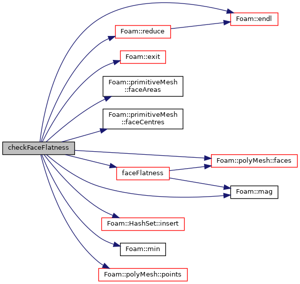 References Foam::endl(), Foam::exit(), primitiveMesh::faceAreas(), primitiveMesh::faceCentres(), faceFlatness(), polyMesh::faces(), Foam::FatalError, FatalErrorInFunction, forAll, Foam::Info, InfoInFunction, HashSet< Key, Hash >::insert(), Foam::mag(), mesh, Foam::min(), points, polyMesh::points(), and Foam::reduce().