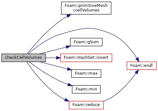 References primitiveMesh::cellVolumes(), Foam::endl(), forAll, Foam::gSum(), Foam::Info, InfoInFunction, HashSet< Key, Hash >::insert(), Foam::max(), mesh, Foam::min(), and Foam::reduce().