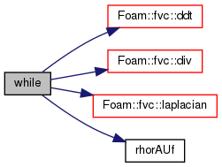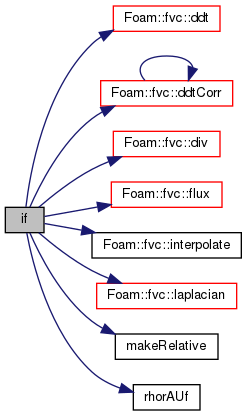References Foam::fvc::ddt(), Foam::fvc::ddtCorr(), Foam::fvc::div(), Foam::fvc::flux(), fvOptions, HbyA, Foam::fvc::interpolate(), Foam::fvc::laplacian(), makeRelative(), MRF, p, phi, pimple, psi, rho, rhorAUf(), rhoUf, and U.